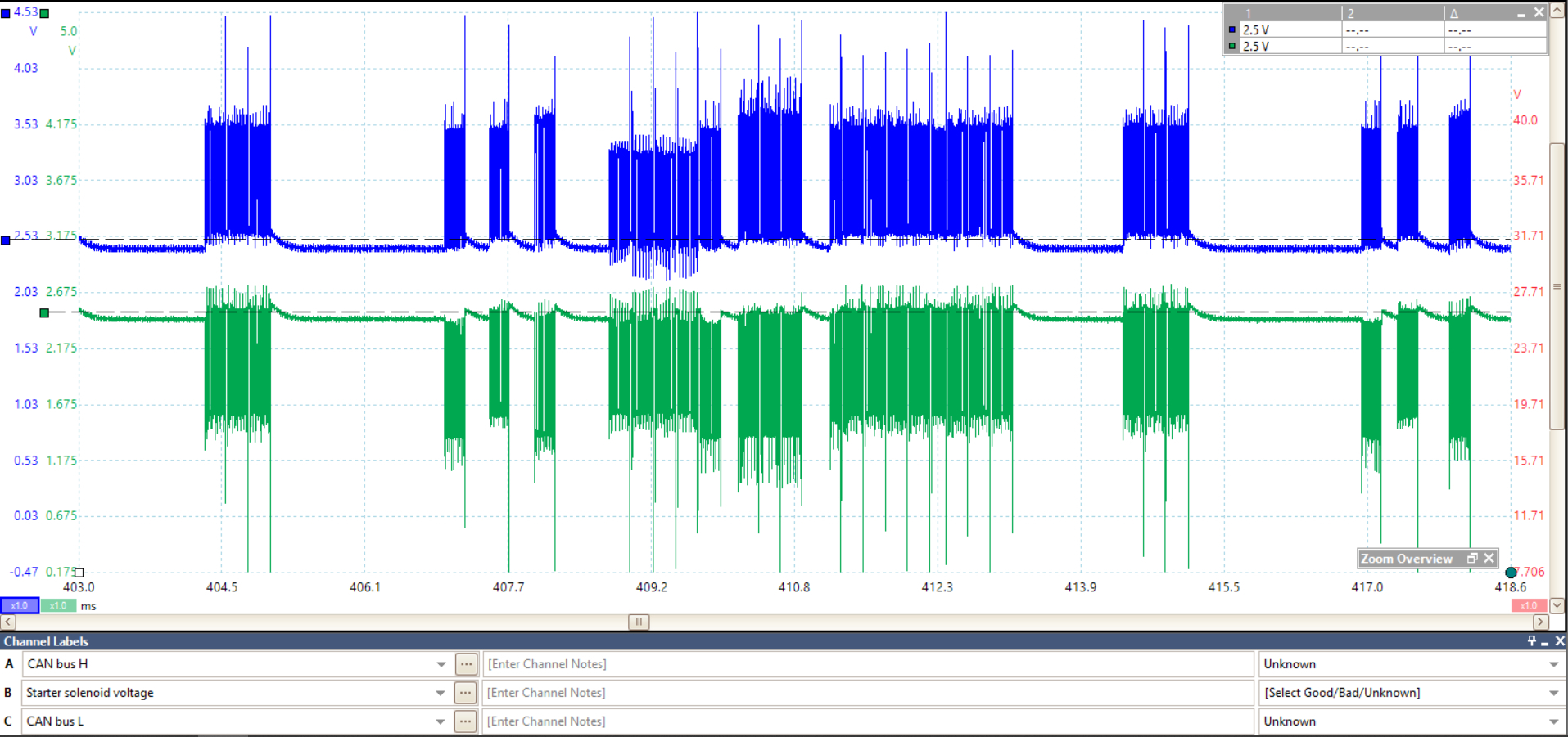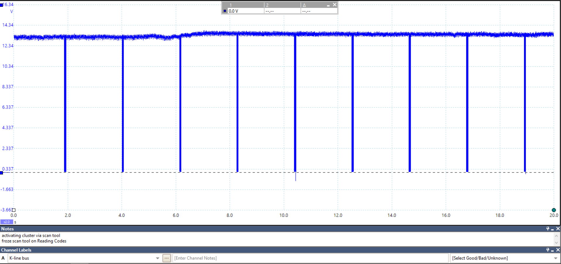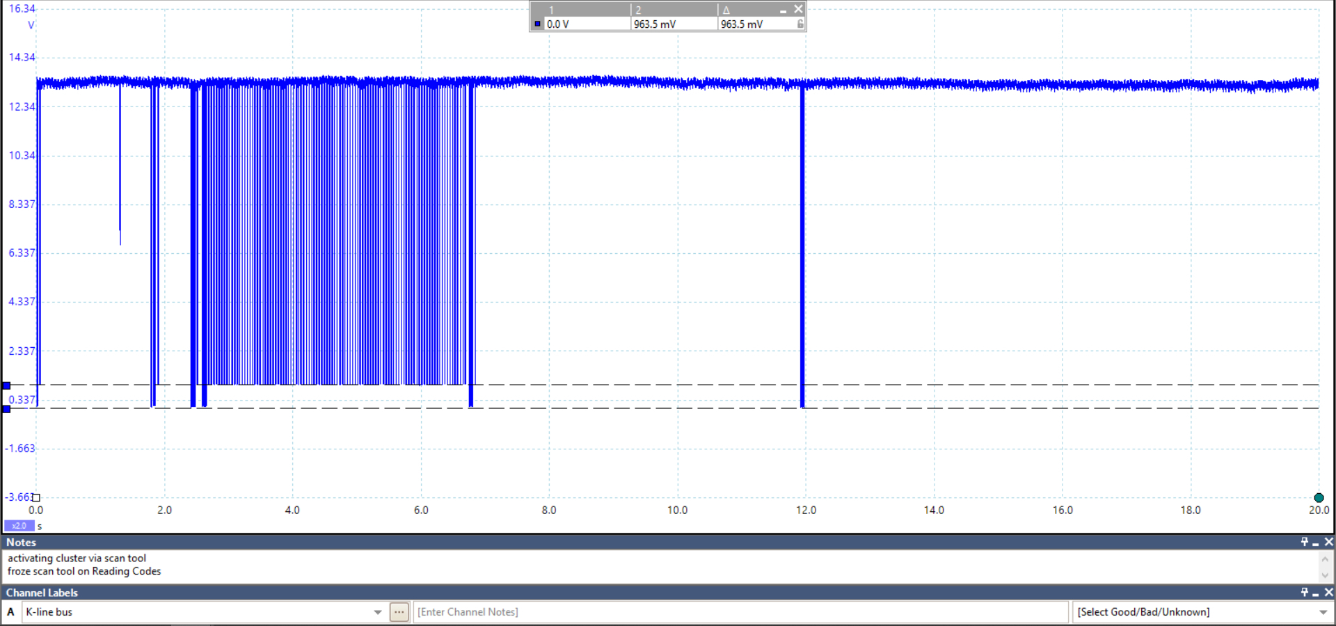 These are a couple of very simple waveforms I captured from a 2013 Hyundai Sonata, this is the K-Line network which is what is used for a scan tool to communicate with this particular vehicle. This vehicle has a fault with the instrument cluster, in the first picture the pulses are my scan tool trying to communicate with the cluster, except the cluster froze its communications when I tried to read codes from it, the 2nd picture (and you can see the difference in voltage levels here) is where the cluster finally responded. The 3rd picture is the vehicles Can Bus High speed network where you can see the voltage levels are all over the place. But there would be no way to know what was happening with the vehicle without a scope, the scan tool would just sit there with a frozen screen trying to read trouble codes and I would have had no idea what was wrong. Granted this is the technical side of things, but you could have checked your cam and crank signals in 5 minutes to see if they looked correct. Not even having to replace any parts until you know whats actually wrong, just the benefits of learning new things. I fully understand the hesitation of it all, buts its like everything else, once you learn it, you are ahead of all the guys that dont use this type of equipment and are just changing parts until they happen to fix something.