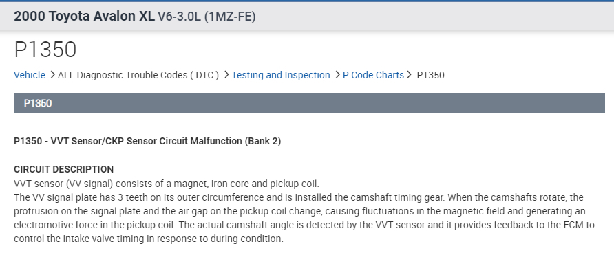 This vehicle doesn't have a separate ignition control module. The code is related to the VVT sensor (variable valve timing sensor) DTC P1350 is specific to the right bank VVT sensor.