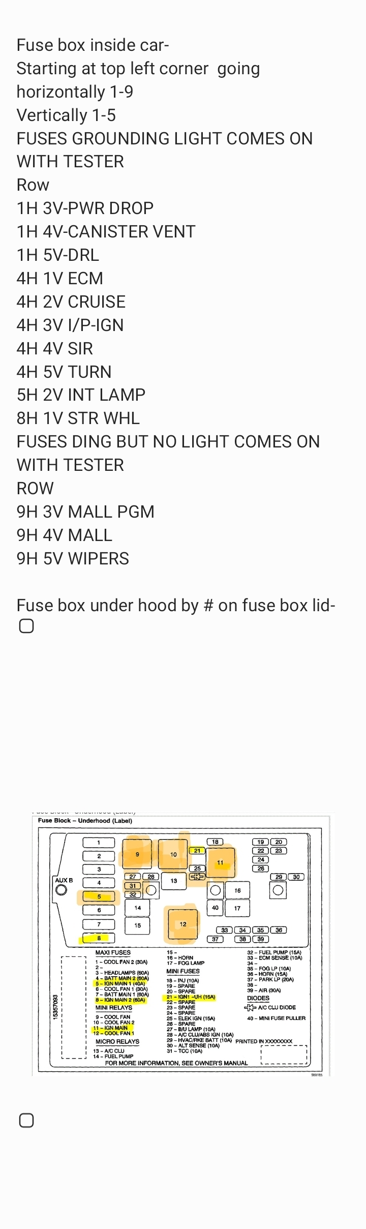 Every time I go to put the ignition fuse in it blows it. I also have a few fuses under the hood and next to the glove box that are showing they have negative current with the tester.