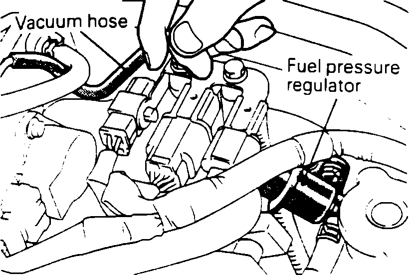 6. Disconnect the vacuum hose from the pressure regulator, and plug the hose end. Measure the fuel pressure at idle.
