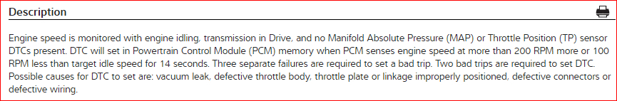 I have owned this vehicle for about eighteen months and no mechanic has been able to figure out this idle problem. It usually runs high, about 1,000 rpm's in gear and up to 1,400 in park. Sometimes it idles beautifully at 750-800 in gear and occasionally gets as low as 400 but does not shut off. So far I have had the vacuum lines smoked twice (two leaks found first time); replaced the spark plugs, TPS, IAC (twice), PCV, throttle body gasket and computer; and cleaned throttle body. Nothing has worked! The only code I get when the CEL is on is P1294, which is not exactly specific. Any other ideas me or my mechanic can follow up on?