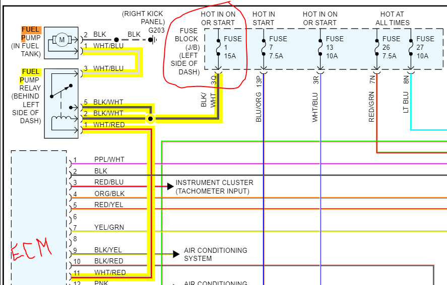 What is happening? Is there anything I can do to help? If it is a fuel-related issue, I attached a portion of the wiring schematic so that you have a reference. Poser from fuse 1 in the fuse box (left side of the dash) provides power to both the primary and secondary sides of the fuel pump relay. The ECM provides a ground path completing the circuit and power then travels to the pump.