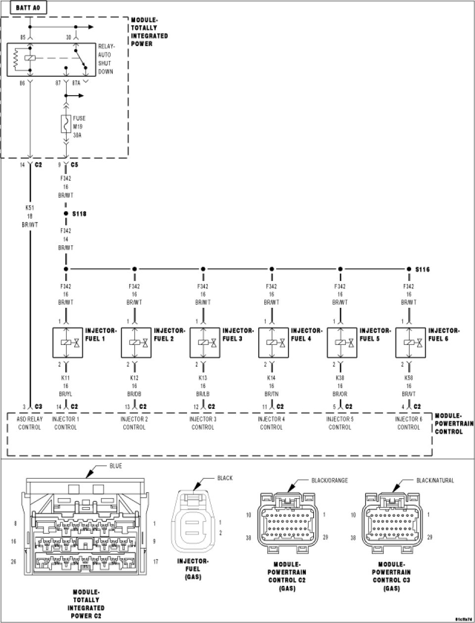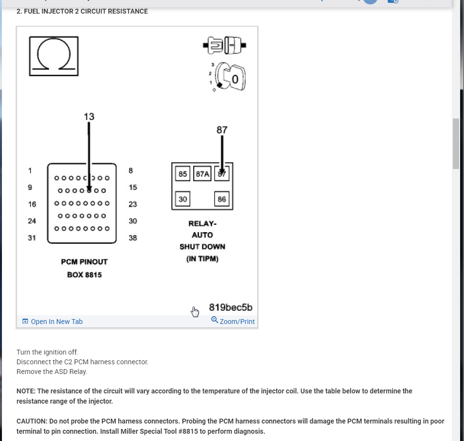 Measure the resistance of the Fuel Injector 2 circuit from the appropriate terminal of special tool #8815 and the ASD Relay connector.