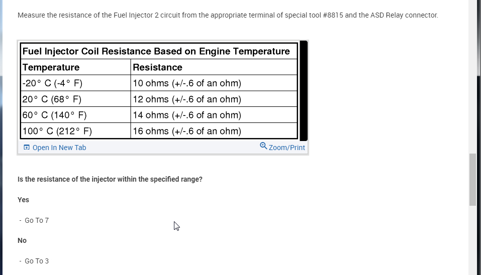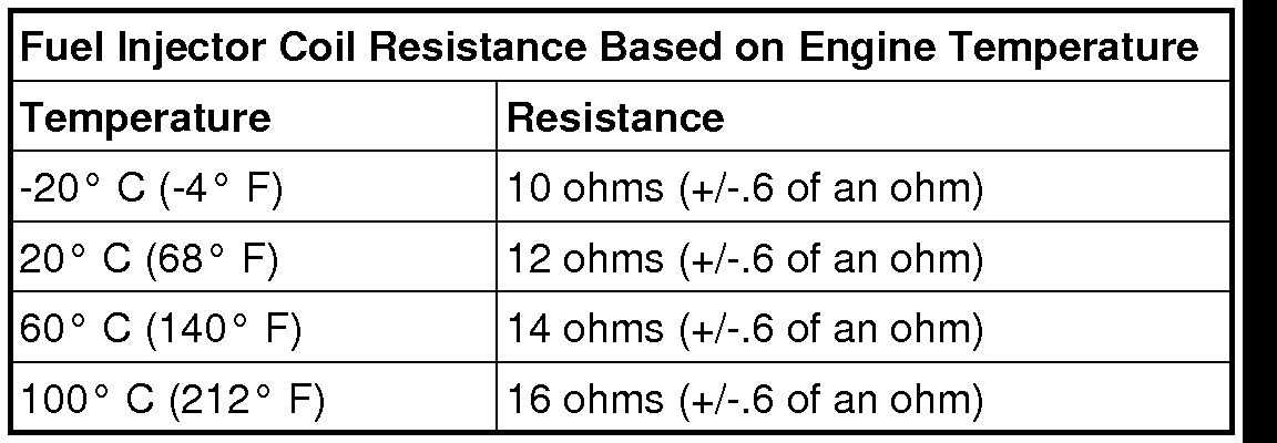 NOTE: The resistance of the circuit will vary according to the temperature of the injector coil. Use the table below to determine the resistance range of the injector.