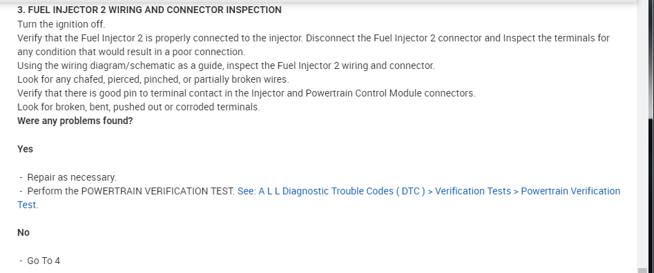 Look for broken, bent, pushed out or corroded terminals. Verify that there is good pin to terminal contact in the Injector and Powertrain Control Module connectors.