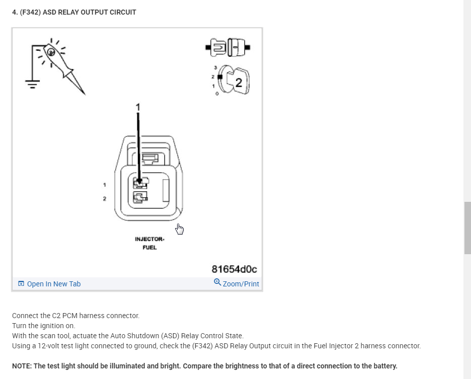 Using a 12-volt test light connected to ground, check the (F342) ASD Relay Output circuit in the Fuel Injector 2 harness connector.
