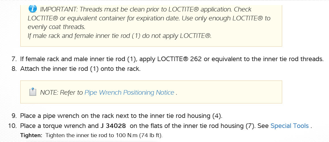 If you need to hold the rack from twisting, that is where the adjustable wrench I mentioned comes in. Unless the last person got really carried away, you can just use the specialty socket and a large ratchet to unscrew the tie rod. After two or three turns, you will feel the resistance as the crimps straighten out. There is little chance of over-twisting the rack here. It is putting the new tie rod on where if tight is good, tighter must be better. I still go by feel and common sense, but if you were to measure the torque, I am sure I am going beyond the minimum spec. That is where I will find a helper to hold the adjustable wrench so I can convince myself the tie rod is tight enough.