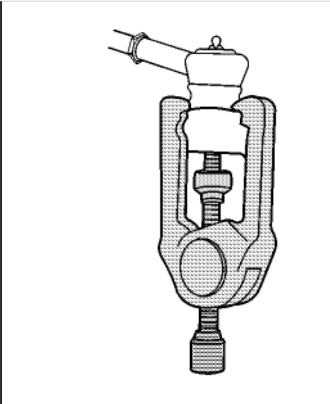 I searched through two web sites for Mac and Matco tools and could not find the tool, then I got smart and did a Google search for "GM inner tie rod crimper". The first two listings show the tool. You might find this at an auto parts store that rents or borrows tools. It looks a lot more complicated than it really is. In this photo, there are two hinged parts and each has a piece cast into it that you can see. The pretty blue arrow is pointing to the end of one of them. Those two parts are what does the crimping when you tighten the bolt. The three-sided black square piece of metal in the middle, shown by my nifty red arrow, is simply there to set the depth of the crimp. In this case, the steering gear would be up over your right shoulder, and the inner tie rod's shaft would be behind the tool pointing to the lower left of the picture. You slide the tool along the rack until the black metal part hits the housing of the tie rod. That places the crimping fingers in the right spot.