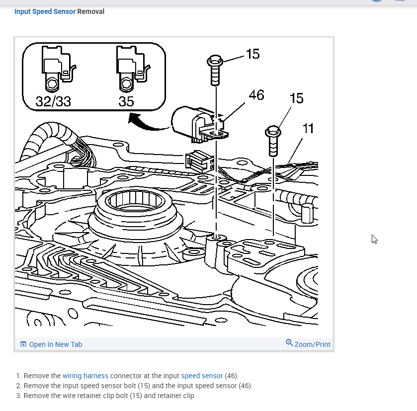 My mechanic says that the input speed sensor on my car needs to be replaced due to error code and rough shifting. Strangely, the tachometer is not working now. Does the transmission have to be dropped or removed to replace this sensor? I have not been able to find real clear pictures on the location if this part.