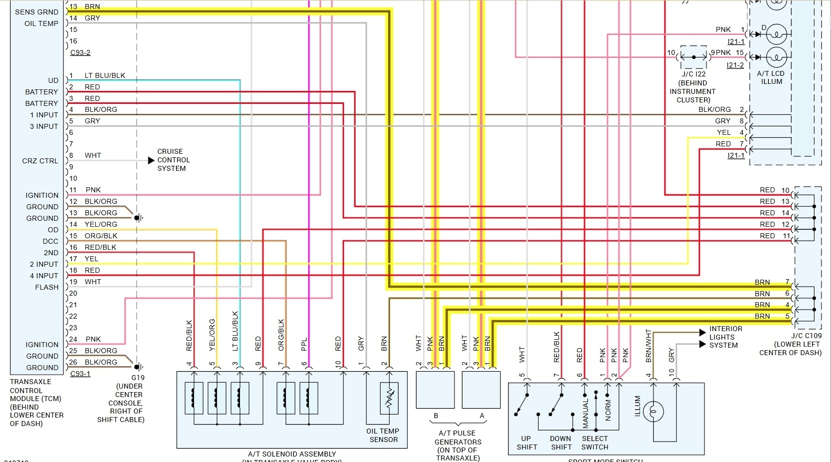 Okay, that could be the harness, the connector or the sensor itself. It's usually an open circuit from either the sensor failure, the connector or a damaged harness. What have you already done? Swapped the sensor? Tested the voltage and ground at the connector itself? For that you should be able to use a meter with the key on and look for battery power on the pink wire in pin 3. Should be a ground through the PCM on the brown wire in pin 1. If those are both there then check for continuity on the white signal wire on pin 2 up to pin 1 in the 93-2 connector on the TCM. There is a TSB about those codes as well. Just covers the testing and a visual inspection of the harness. I would test each of the three wires, then if one of them is bad replace only that wire, replacing the harness (if you could even find a good one) requires far more work. The first step of which is to remove the engine so you can access all of the harness sections. For example if you don't find a ground at pin 1 in the input sensor, it shares that connection with the output sensor, you could simply run a jumper between them, same with the power feed. The signal wire though would be a single wire.