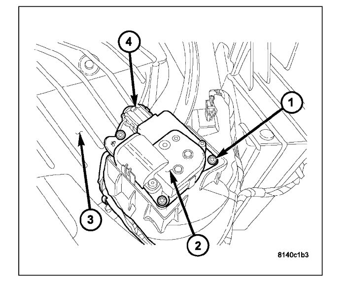 3. Remove the three screws (1) that secure the blend door actuator (2) to the top of the HVAC housing (3).