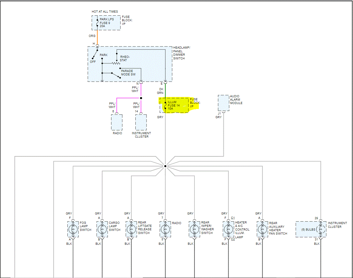 I attached the wiring schematic for the instrument cluster illumination for your review. I highlighted the fuse I'm referring to.