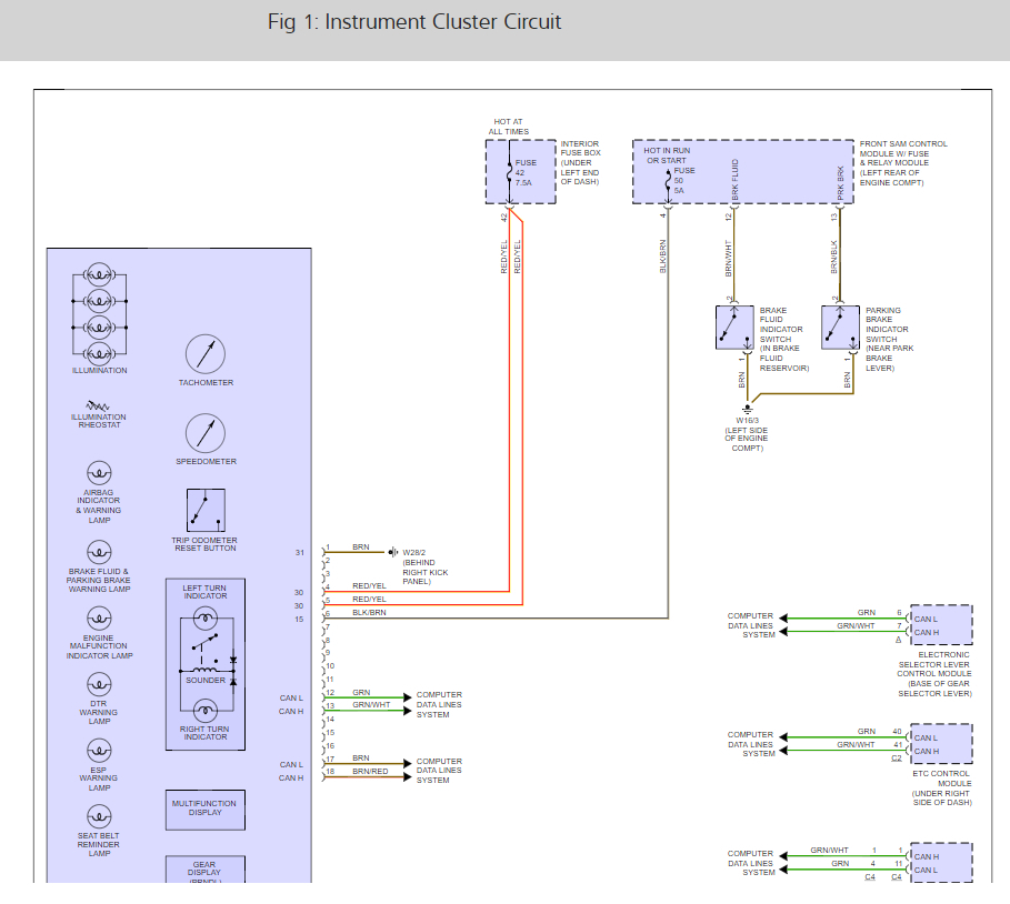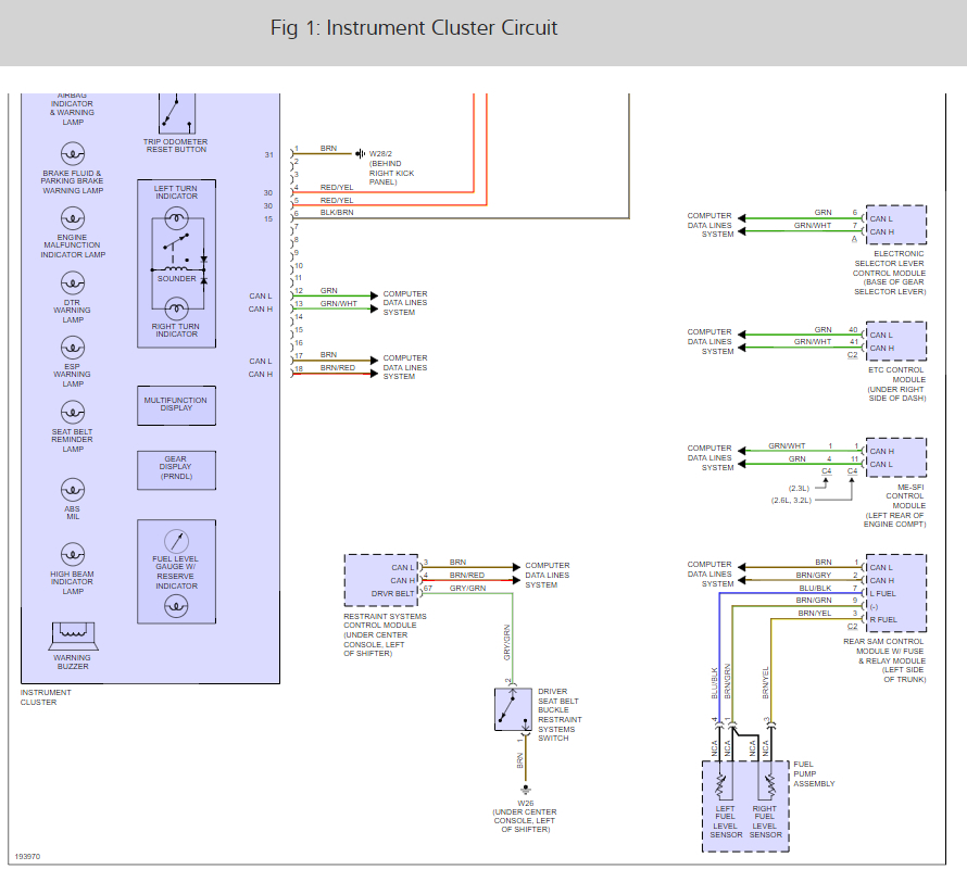 The fuel gauge, parking brake, speedometer, main beam, plus the sound for all indicators etc.