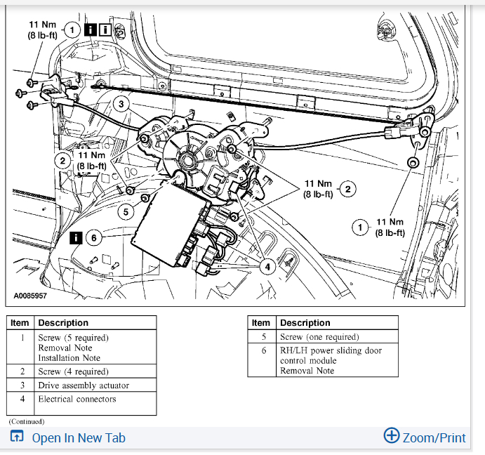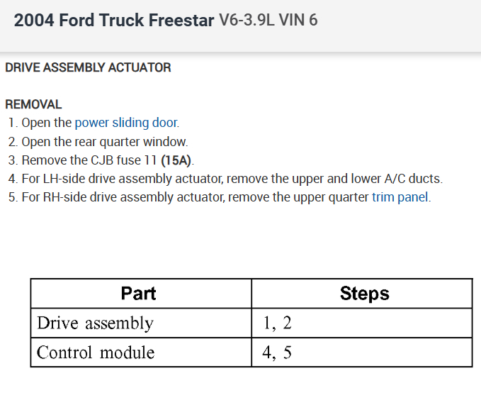 1. Disconnecting the battery or smart junction box (SJB) fuse 11 (15A) will cause the power sliding door control module to lose memory. The power sliding door initialization procedure must be carried out before the power sliding doors will operate under all conditions. The power sliding door initialization procedure is a learning process for the module to identify the full open position and the full closed position. After power is restored to the vehicle, initialize the sliding doors as follows: