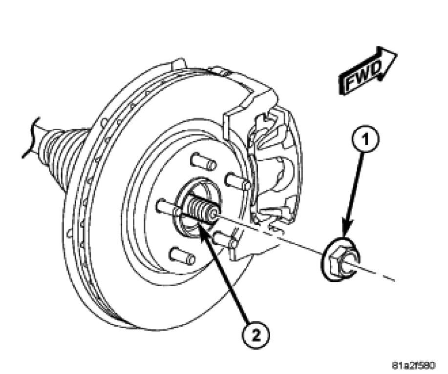 3. While a helper applies the brakes to keep the hub from rotating, remove the hub nut (1) from the axle half shaft (2).