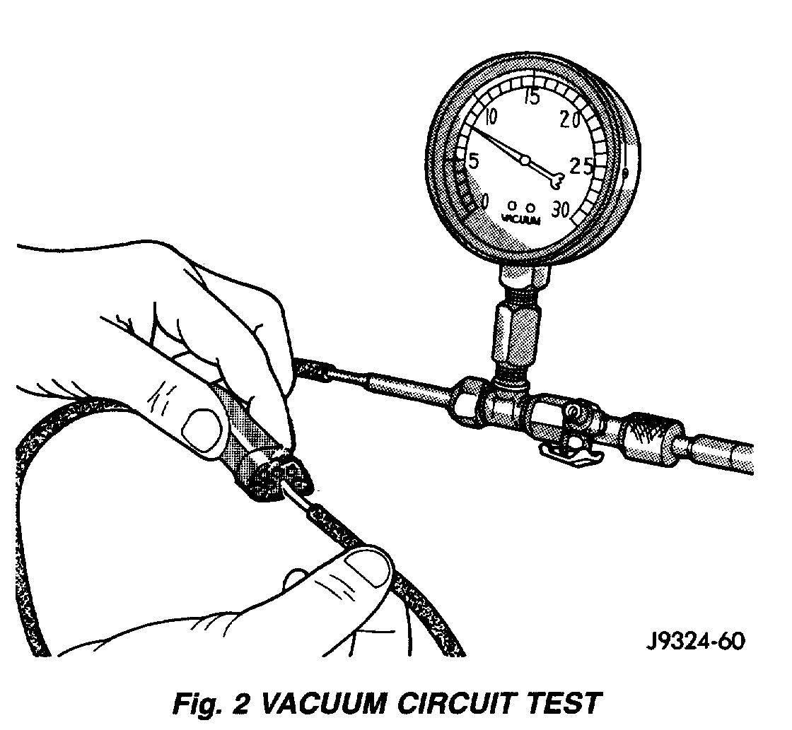 5. Connect the test set hose or probe to the open end of the leaking circuit. The test set gauge should return to the 27 kPa (8 in. Hg.) setting shortly after each connection is made. If OK, replace the faulty disconnected component. If not OK, go to Step 6.