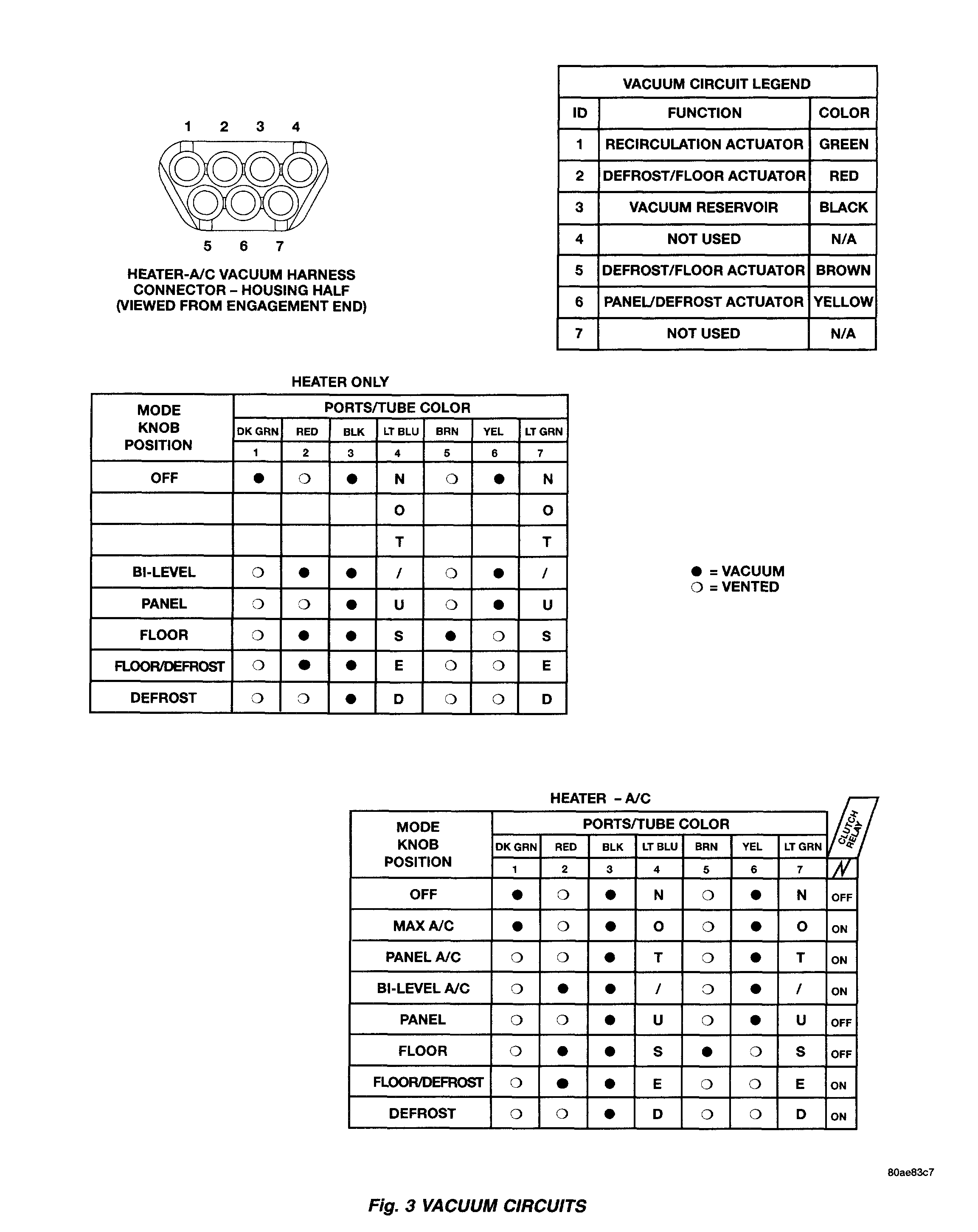 2. Connect the test set vacuum hose probe to each port in the HVAC housing half of the vacuum harness connector, one port at a time, and pause after each connection. The test set gauge should return to the 27 kPa (8 in. Hg.) setting shortly after each connection is made. If OK, replace the faulty a/c heater control. If not OK, go to step Step 3.