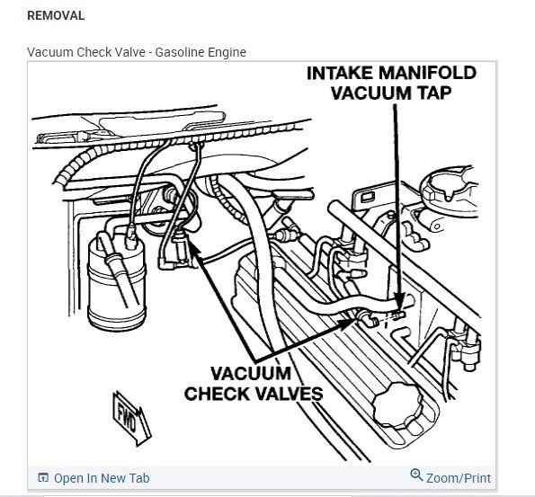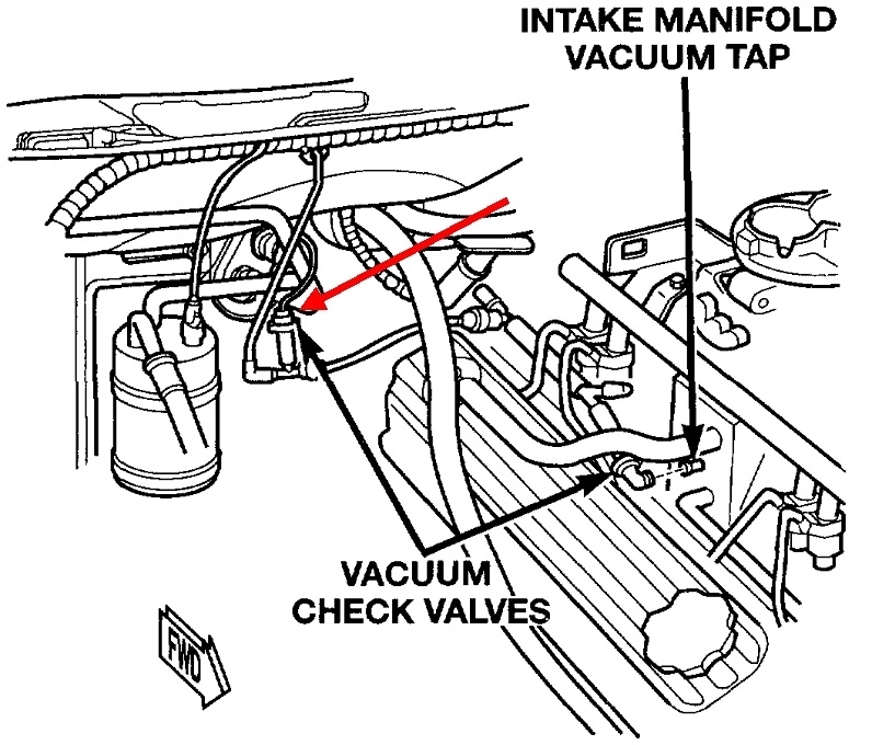 My red arrow in this drawing is pointing to the check valve in the vacuum hose that runs into the passenger compartment and runs the heater controls. It's on the firewall under the wipers. That valve is about the size of a stack of three nickels. The dealer's parts department has a replacement check valve that is roughly the diameter of a 50 cent piece, and about an inch and a half long. This one includes a small vacuum storage canister. It can be used to solve this problem on other brands of vehicles.