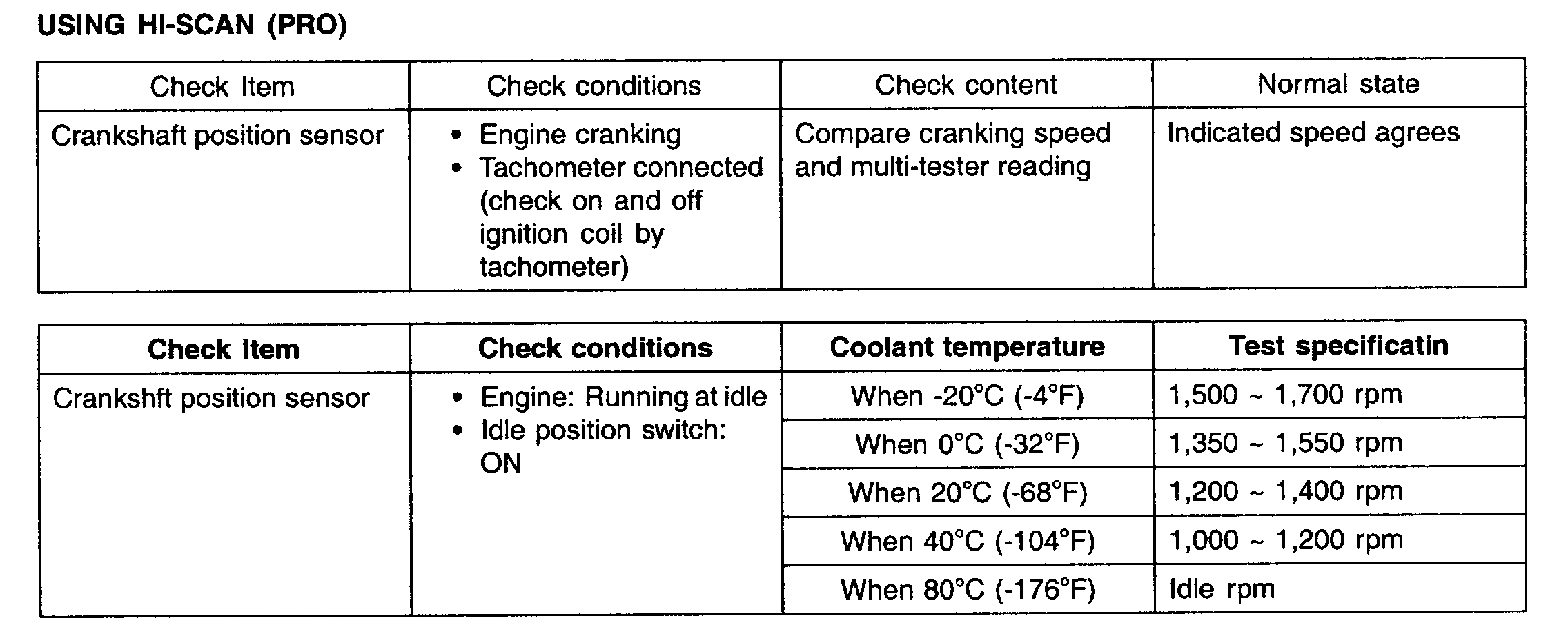3. If the engine can be run at idle even it the crank angle sensor reading is out of specification, check the following: