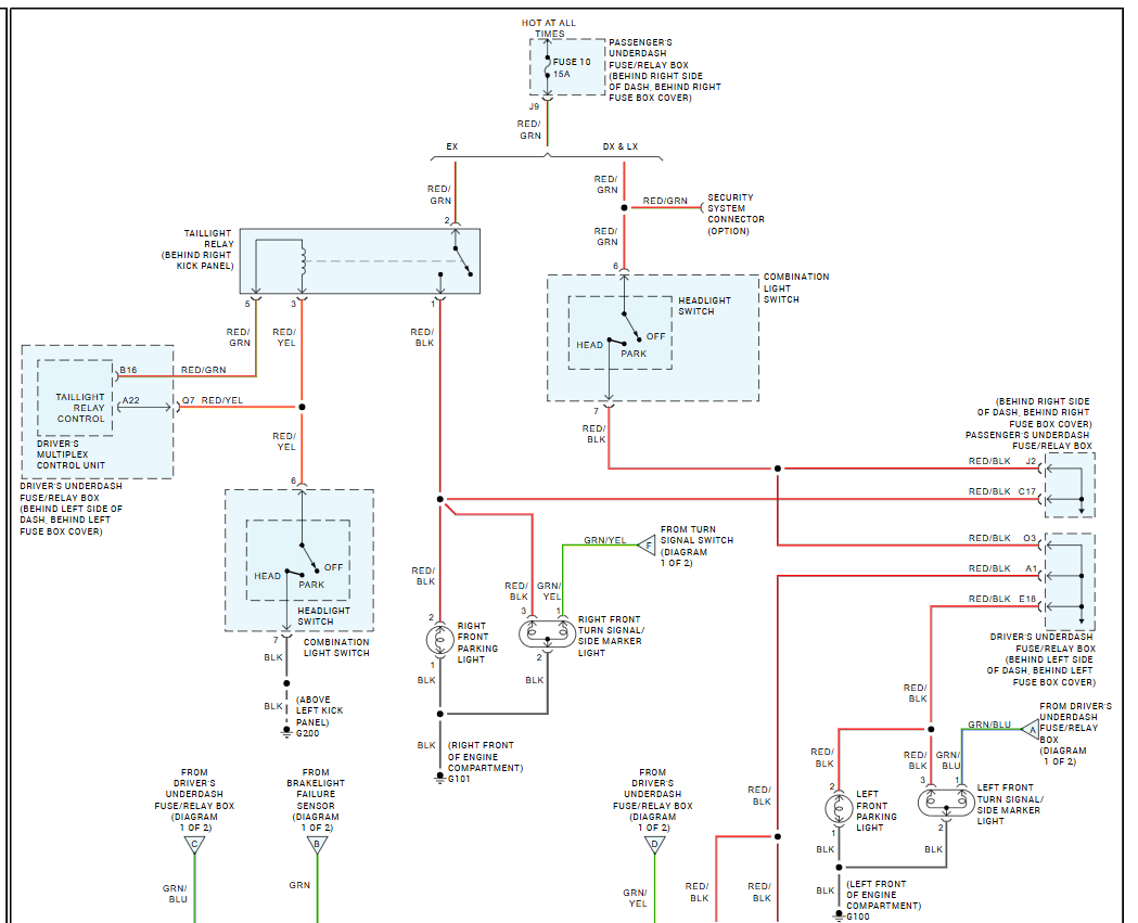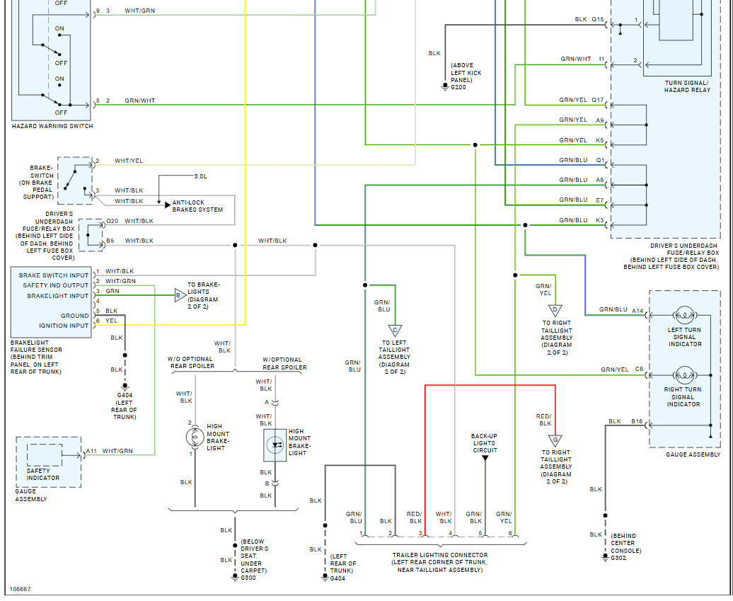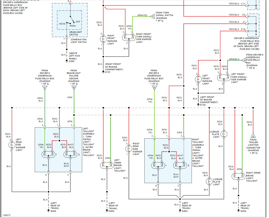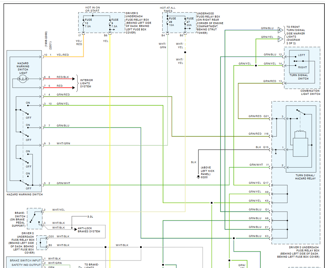 Okay, so if I trace it correctly G 100 is on the driver side inner fender right next to the headlight, I checked that, and all the grounds look good there. No broken wires no corrosion same as on G 200 and I also have uploaded a video of what it is doing because it did it to me on my way to work this morning. And when I got to work, I tried turning the bulb around all of that stuff taking the bulb out seeing if that changed anything it did not the rears still did not activate, and I did not hear the relay click either. And I just checked my hazards, and they are not working with my headlights on.