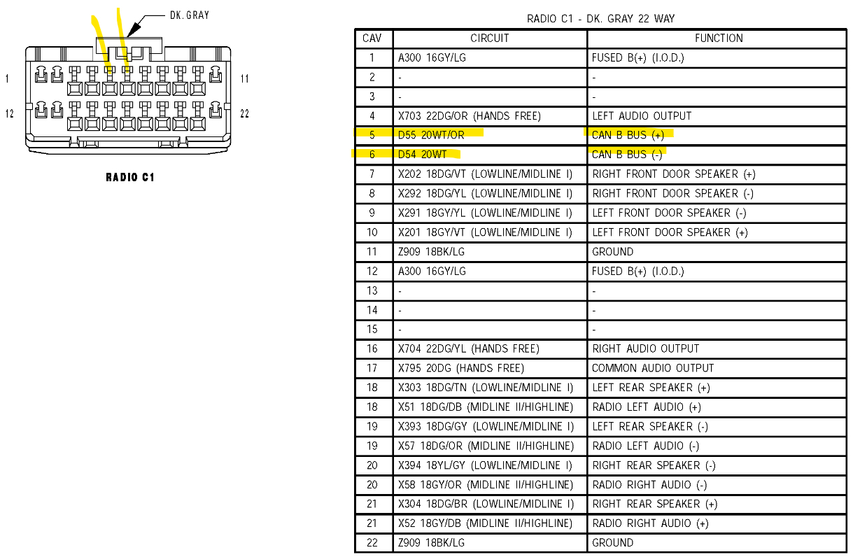 The CAN B doesn't run to the Data Link Connector, only CAN C goes there. All those ECM pin readings are correct. But you're not checking the CAN B, you're only reading the terminating resistors of the CAN C network. Thats why I put the diagrams up for checking the pin 2 and 3 of the Front Control module, connector C1, not the ECM connector. But if you're finding a lot of corroded and loose wires in the dash then keep repairing them, Also if you have the Radio out already you can check the CAN B Bus there, that will be even easier because you have it out already, Ill post the Radio connector pinout, but you should see 2 twisted wires on the Radio connector white/ orange and white, those are the CAN B wires. Check the voltage levels there. If you're finding a lot of corroded wires, with green or white corrosion, this vehicle probably has a water intrusion issue.