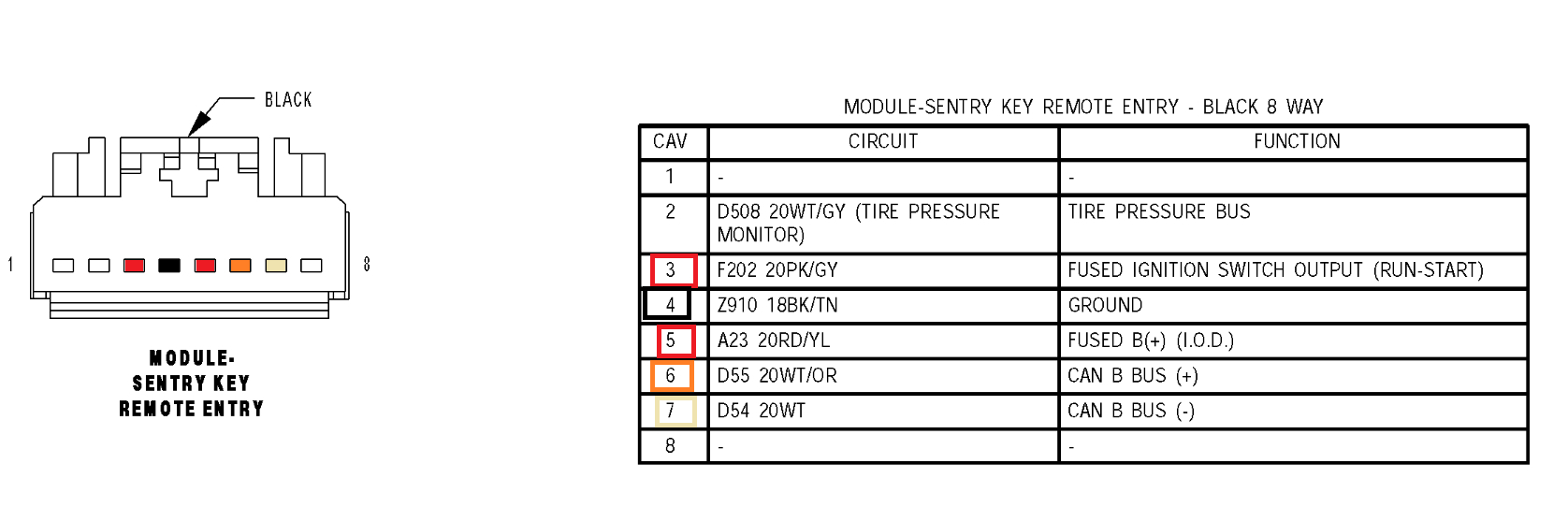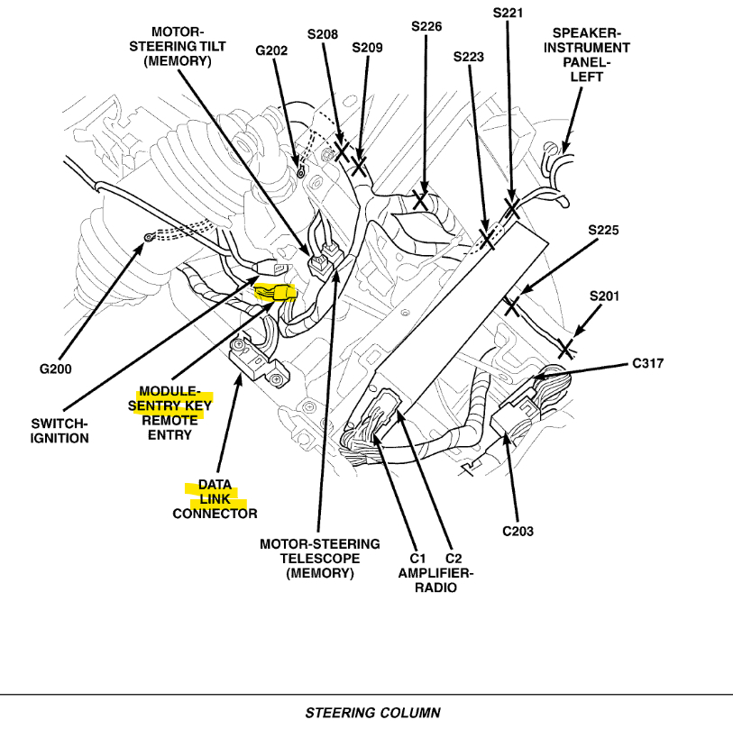 Then the Sentry Key Module is on the Steering Column, in the diagram see where the Data Link Connector is, the module looks to be located just behind that. Look for the connector according to the wire colors, it's a 6-wire connector, I've marked the powers and ground as well as the 2 CAN B wires, again look for the 2 twisted wires, the canbus wires are always a twisted pair.