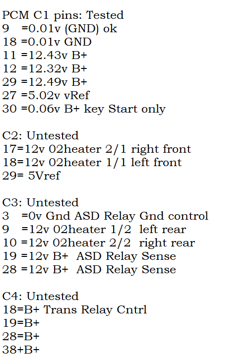 I tested the pins at the module power train control C1 black/black connector of the ECM and noticed that for pin 9 and 18 = 0.01v; pin 11, 12, and 29 =12.43, 12.32 and 12.49 volts; pin 30=0.06v ; pin 27 =5.02 volts. Those were the few things I checked.