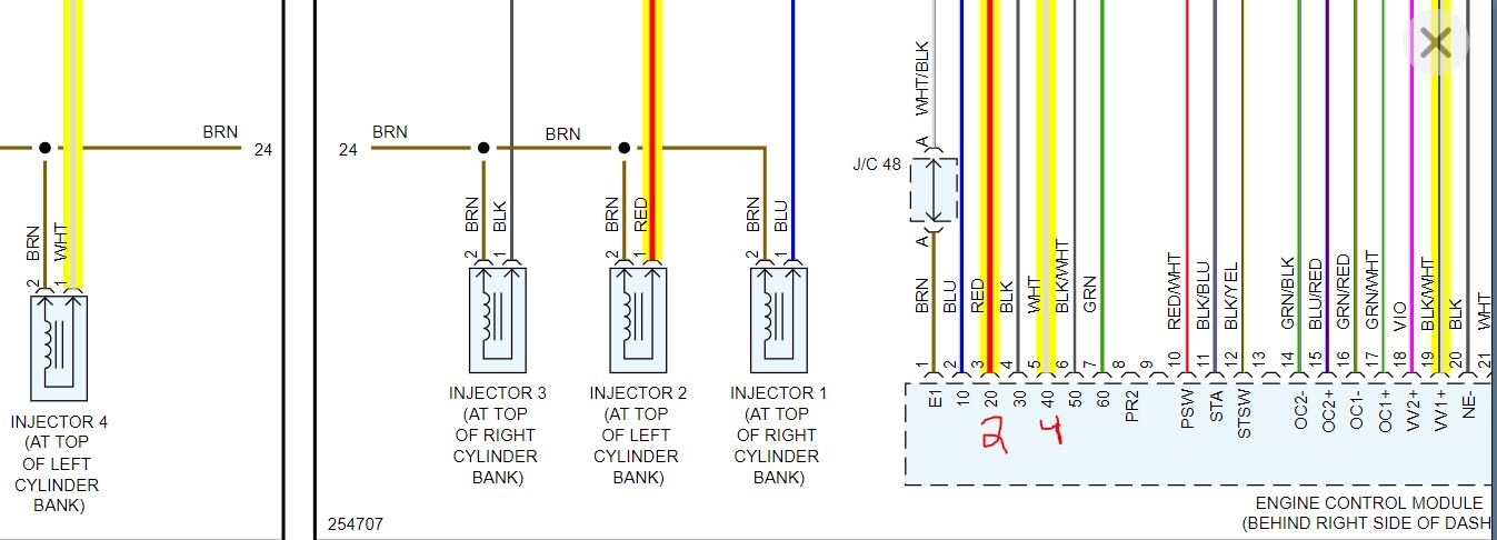 Let me know what you find. Also, keep in mind, there is a common brown wire that runs between the injectors as a ground. Each injector is spliced to that ground, so make sure nothing there is loose or corroded.