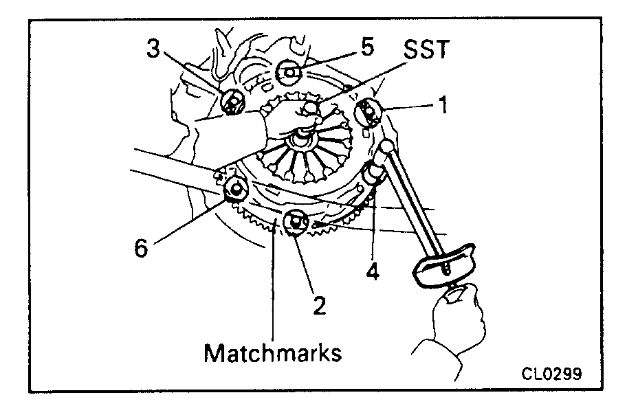 (d)Torque the bolts on the clutch cover in the order shown.