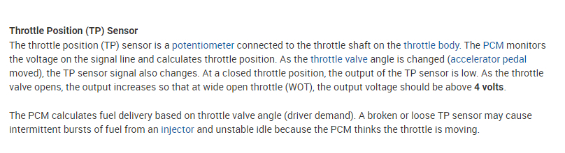 The throttle position (TP) sensor is a potentiometer connected to the throttle shaft on the throttle body. The PCM monitors the the signal and calculates the throttle.