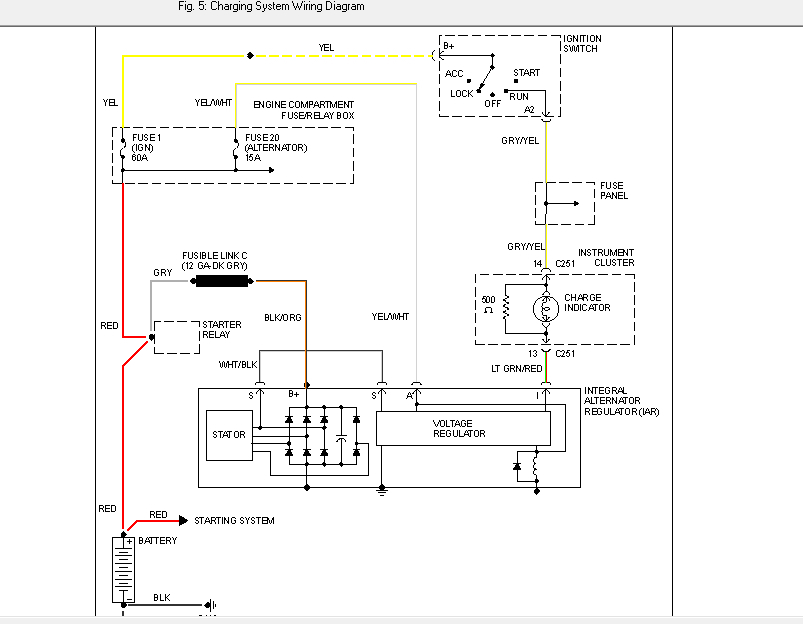 It seems you have a blown fuse for alternator fuse 20 15A at engine compartment fuse/relay box or the wiring problem leading to the alternator.