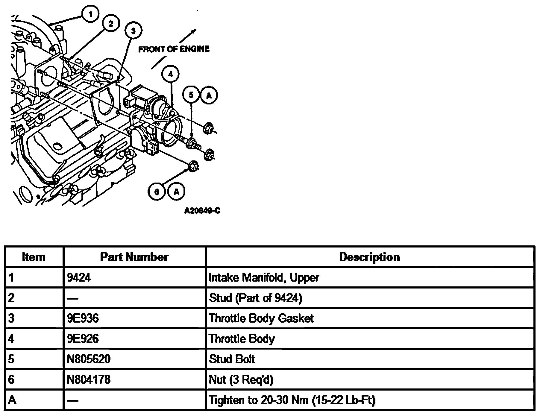 5. Install new throttle body gasket (TB gasket) (9E936), throttle body if removed. Cross-tighten retaining nuts to 20-30 Nm (15-22 lb-ft).