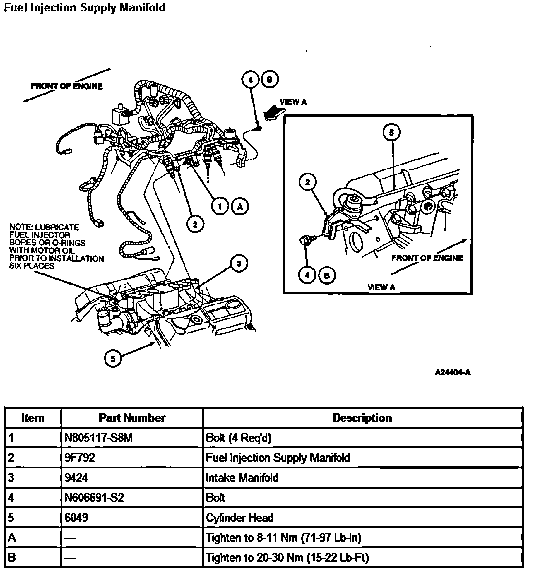 10. Install fuel injectors and fuel injection supply manifold. Tighten fuel injection supply manifold to lower intake manifold bolts to 8-11 Nm (71-97 lb-in). Tighten fuel pressure bracket bolt to 20-30 Nm (15-22 lb-ft).