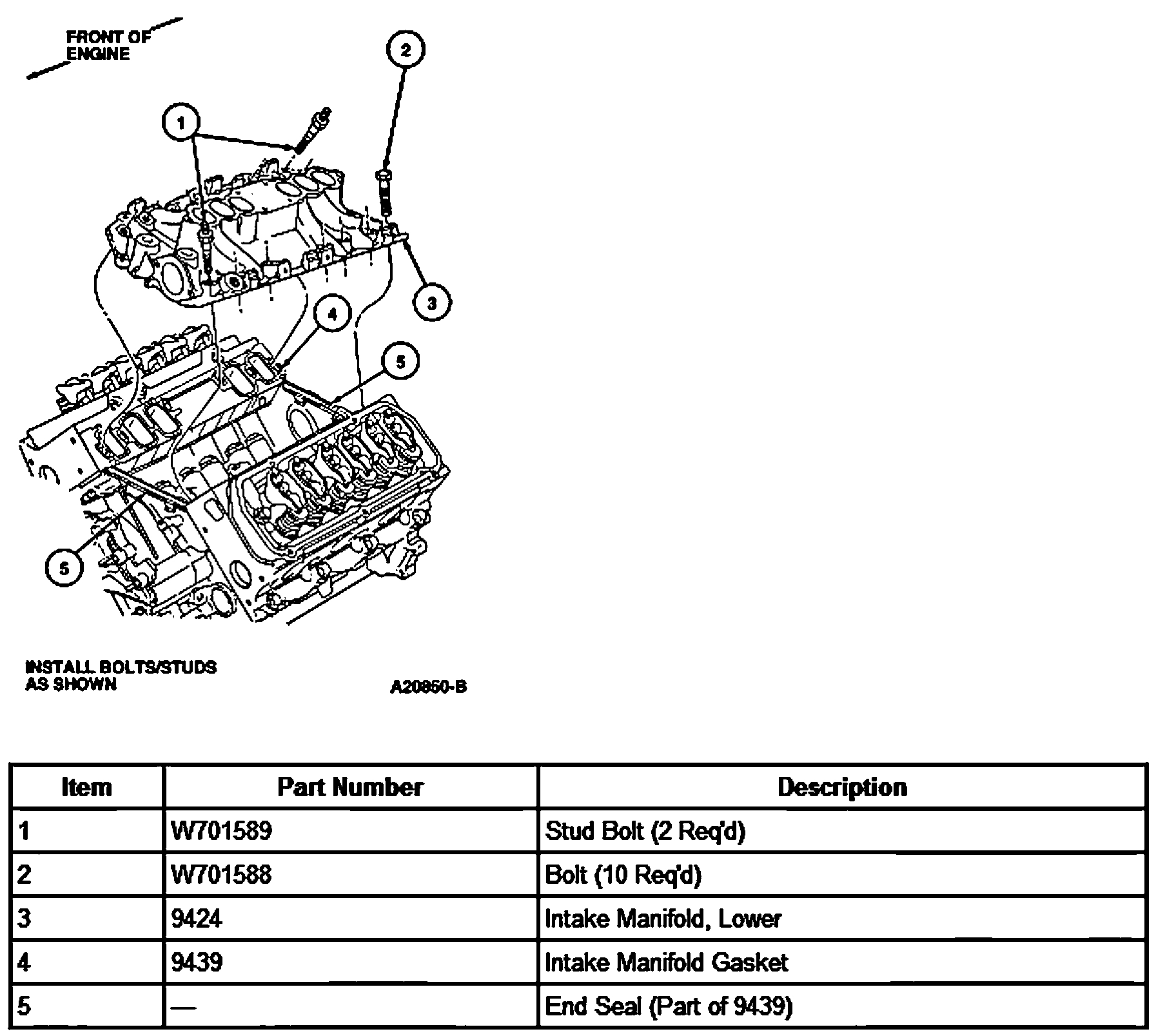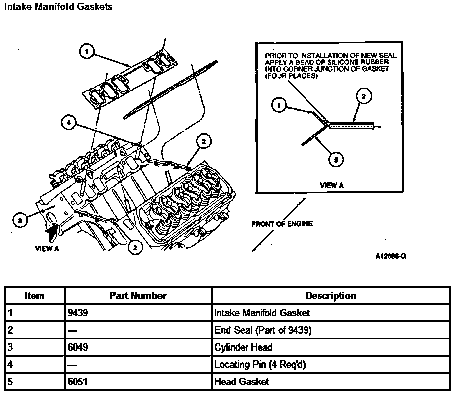 NOTE: Prior to applying sealer, clean sealing surfaces of cylinder heads (6049) and lower intake manifold with Metal Surface Cleaner F4AZ-19A536-RA or equivalent meeting Ford specification WSE-M5B392-A to remove all residues that may interfere with the sealer's ability to adhere.