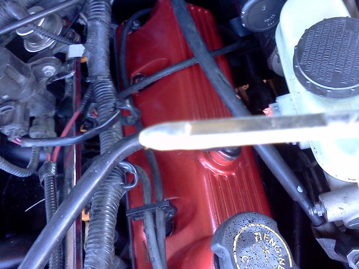9. Remove the nut and bolt retaining engine support and wiring retainer bracket located at the LH front of the intake manifold and set aside with ignition wires.