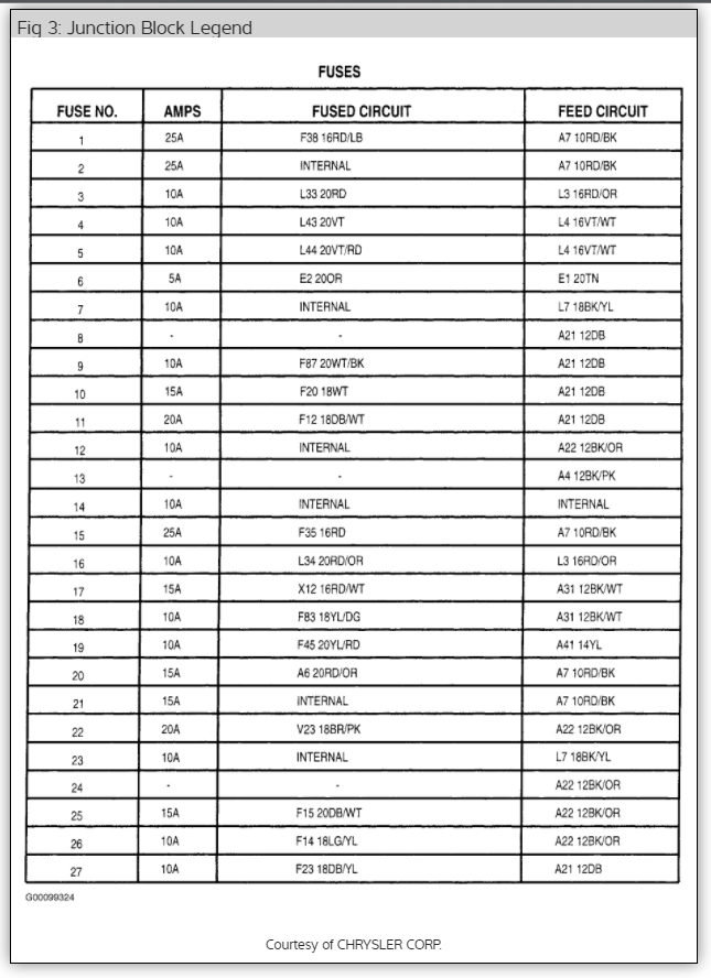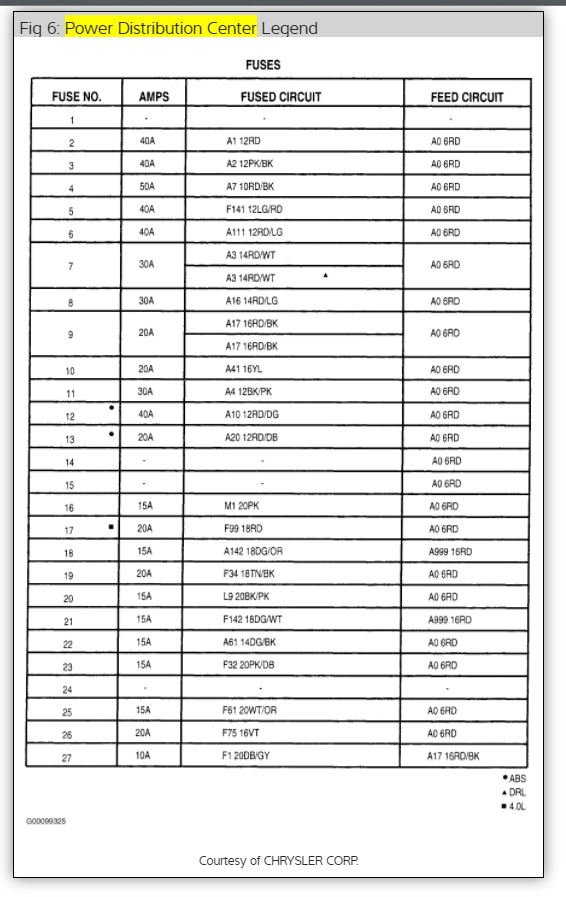 Well that is interesting. the schematic that I am using (Haynes manual, Cherokee 84-01 copyright date 2005) designates the fuse as #22 and I see that your schematic designates #23. although they (the schematics) are identical otherwise. Guess I'll be checking #23 in the morning. And yes the fuse in 22 is good and lights at both test posts.