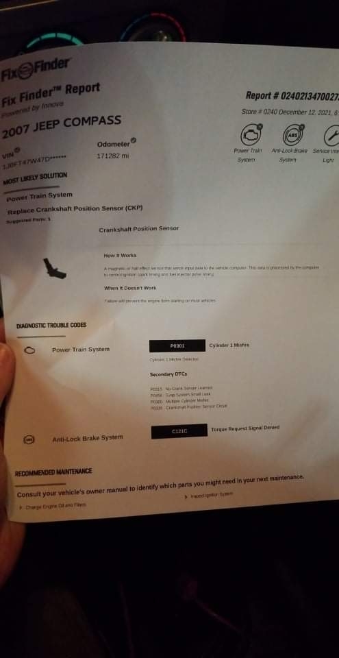 Just to jump in on this sounds like a possible crank sensor issue but with the ABS code I would start with checking the oil level. Before you do anything else, I would suggest checking the oil level and make sure it is full. If it is low, then that can cause all sorts of issues like this on this engine.