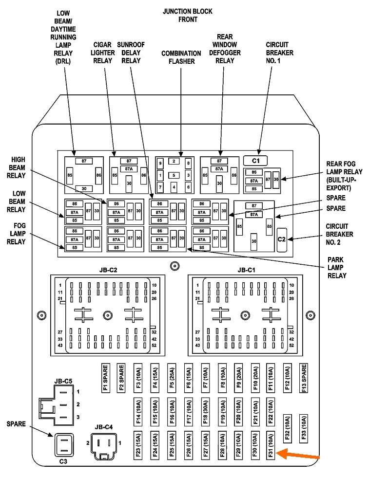 If 12 volts is missing on terminal # 86 when the ignition switch was held in the "crank" position, check fuse # 31. That's in the Junction Block, inside on the left end of the dash. That's my nifty orange arrow in the 7th drawing. If that fuse is okay, you'll notice there's two tiny holes on top for test points. Use the test light to check for 12 volts on both of them when the ignition switch is in "crank". If it's missing on both of them, we'll have to work back toward the switch.