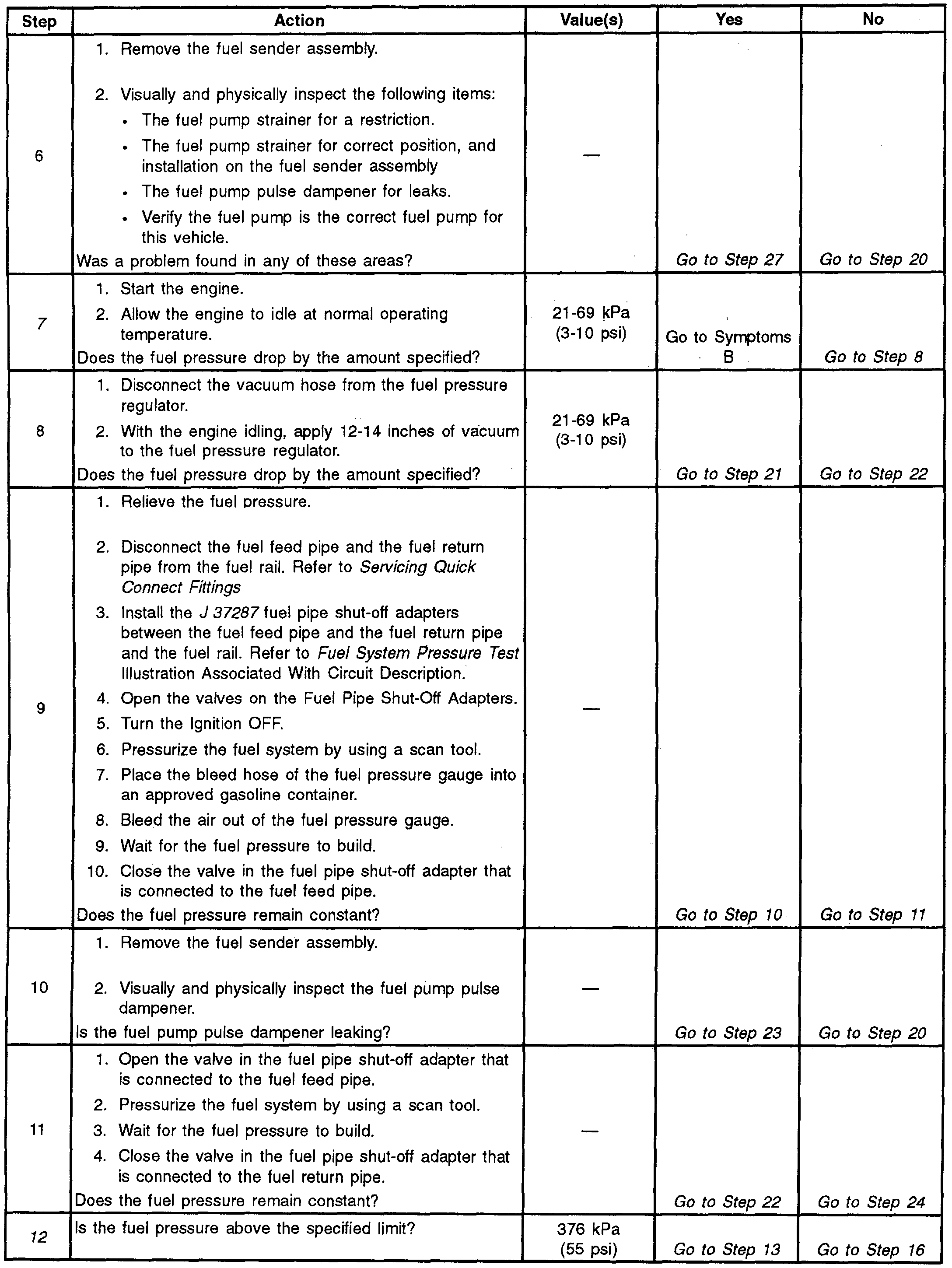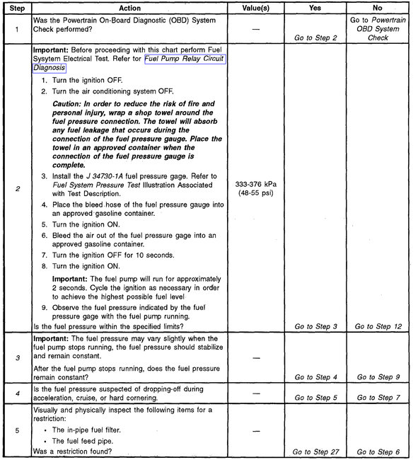 Here are directions specific to your vehicle for diagnosing fuel pressure issues and checking pressure. The manufacturer's specs are included. Also, the attached pictures correlate with the directions as well as diagnoses.