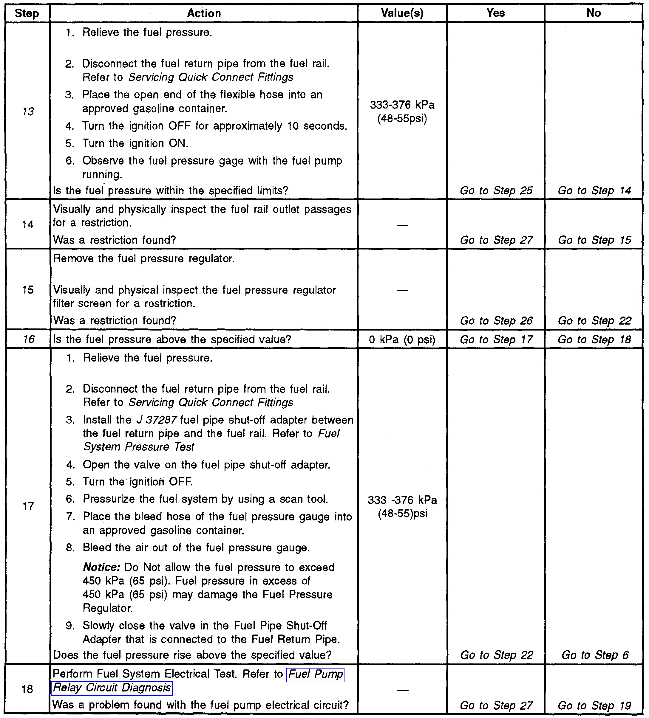 13. This test determines if the high fuel pressure is due to a restricted fuel return pipe or if the high fuel pressure is due to a faulty fuel pressure regulator.