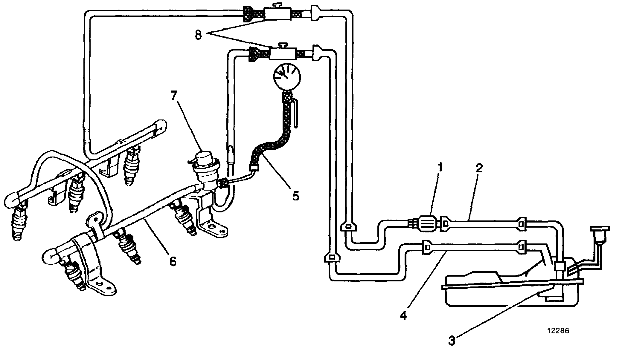 When the ignition switch is turned ON, the Powertrain Control Module (PCM) will turn ON the in-tank fuel pump. The in-tank fuel pump will remain ON as long as the engine is cranking or running and the PCM is receiving reference pulses. If there are no reference pulses, the PCM will turn the in-tank fuel pump OFF 2 seconds after the ignition switch is turned ON or 2 seconds after the engine stops running. The in-tank fuel pump is an electric pump, attached to the Fuel Sender Assembly. The in-tank fuel pump (3) supplies fuel through the fuel feed pipe (2), and in-line fuel filter (1) to the Fuel flail Assembly (6). The fuel pump is designed to provide fuel at a pressure above the pressure needed by the fuel injectors. A fuel pressure regulator (7), attached to the Fuel Rail, keeps the fuel available to the fuel injectors at a regulated pressure. Unused fuel is returned to the fuel tank by a separate fuel return pipe (4). The fuel pressure gauge J 34730-1A(5) and fuel pipe shut off adapters J 37287(8) are used for fuel system diagnosis.
