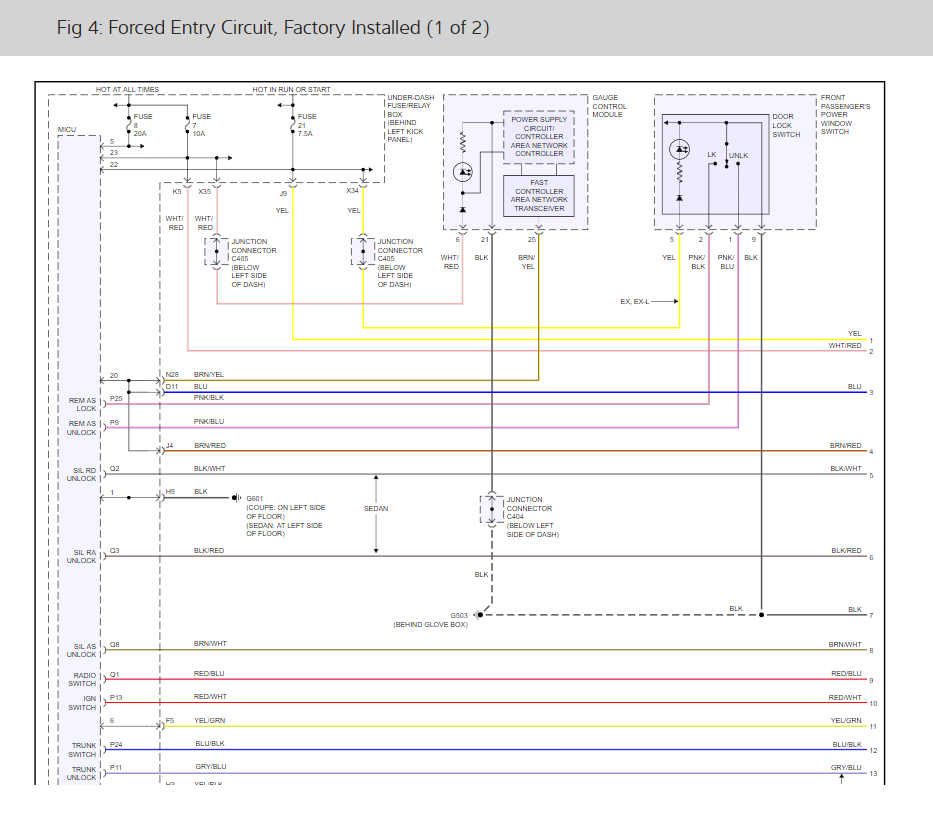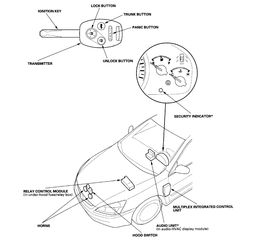 The keyless entry system is integrated with the MICS. The multiplex integrated control unit (MICU) receives LOCK, UNLOCK and PANIC signals from the door multiplex control unit (keyless receiver).