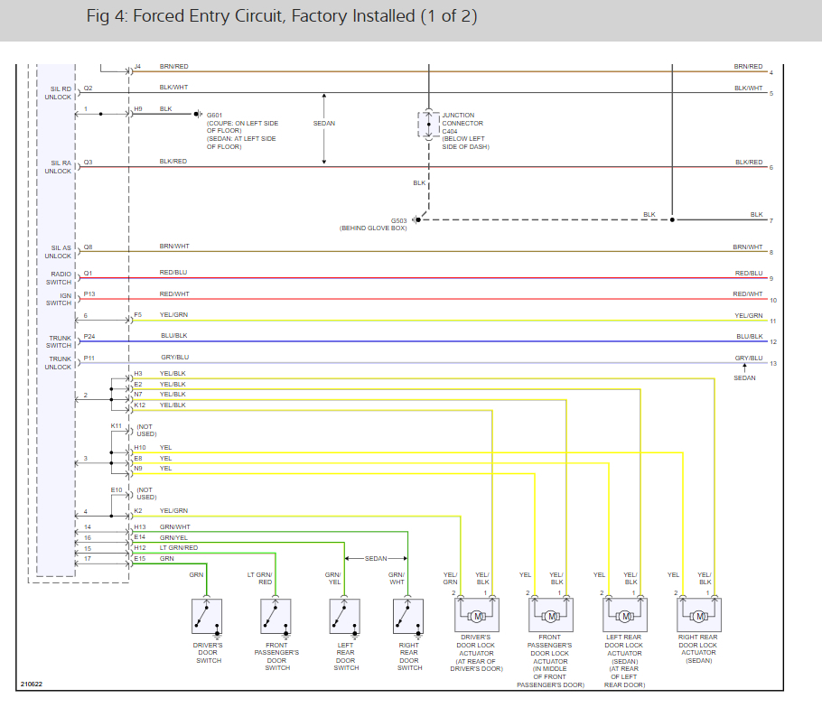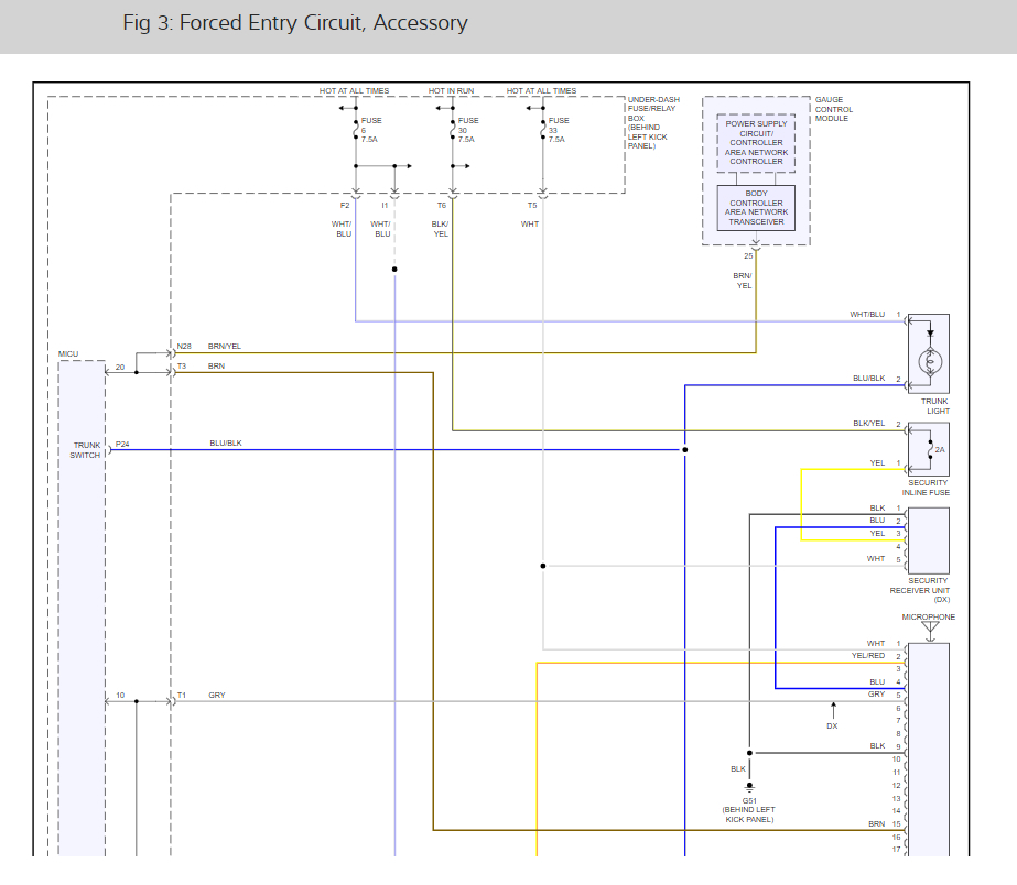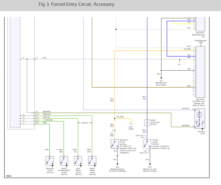 When everything is closed and locked, the only inputs that are grounded, and have 0 volts, are the driver's door lock knob switch (LOCK position), and the integrated audio-HVAC display module. In other words, all of the other switches are open, and have about 5 volts with system awake and 1 volts in sleep mode, including the key cylinder switches. The security indicator in the gauge control module begins to flash immediately after the vehicle is completely closed and locked, and 15 seconds later, the security system arms and the security indicator flashes on fora shorter amount of time than before. If the security indicator does not flash, the system is not arming. A beep sounds and parking lights flash to confirm the security alarm system is armed if the LOCK button is pressed a second time within 5 seconds.