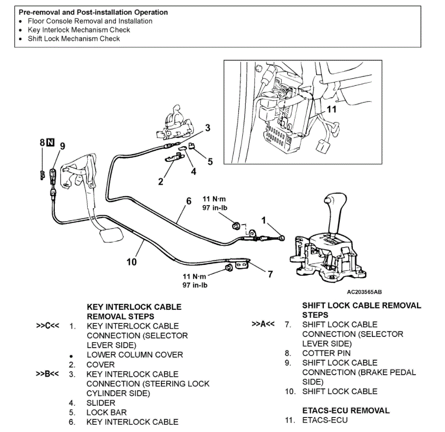 Yep, you are correct. My first suspect is the key interlock cable is out of adjustment. This requires the removal of the floor console which is the most work. LOL Adjustment is simple.