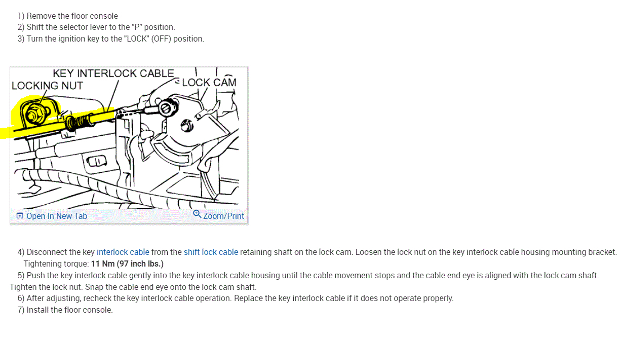 First, if you look at the first two pics below, I included the key interlock cable adjustment procedure. If you notice, there is one nut that holds the cable in place. If the cable slips under that retainer, what you are experiencing will result. So, it will be a matter of loosening that nut, pushing the cable back into the correct position, and then retightening. The directions explain the process step by step and include pics to help you identify the components.