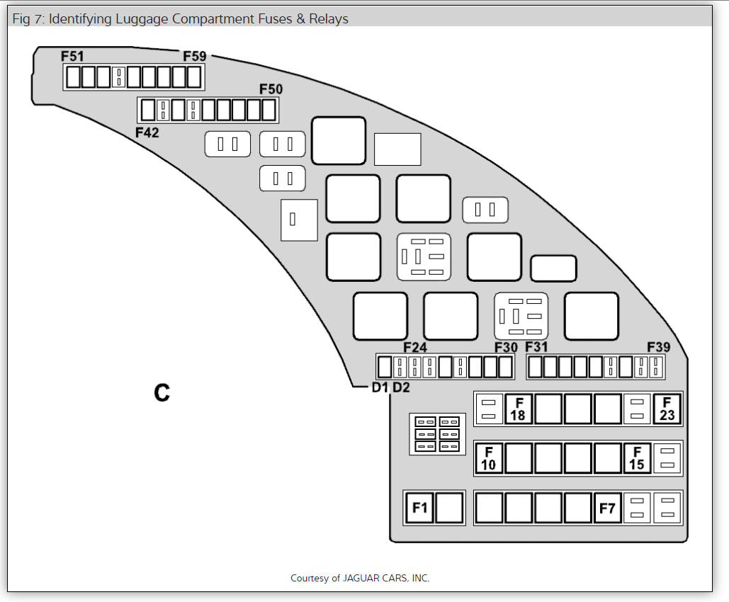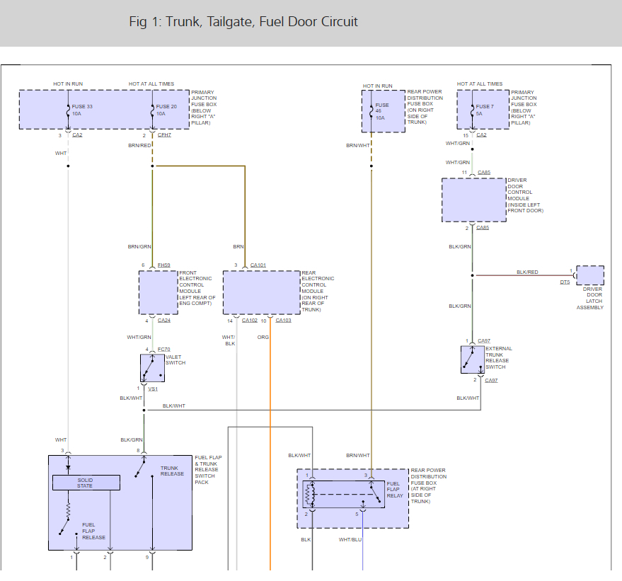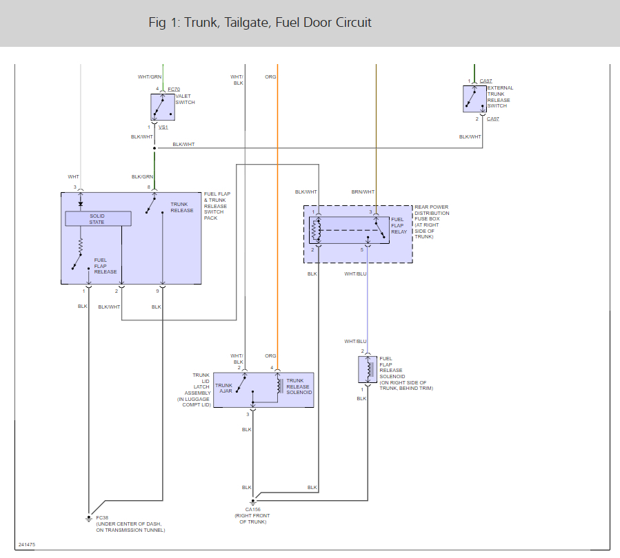 Here is the trunk wiring diagrams and fuse panel location and identifications (below) so we can see how the system works.