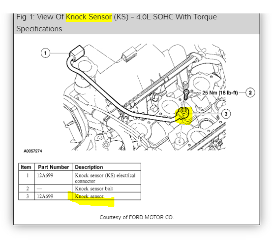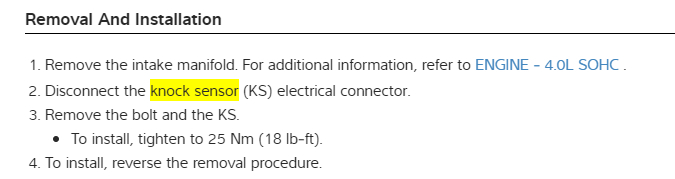 The knock sensor on this engine is under the intake manifold. See pic 1 below. Pic 2 is the very basic replacement directions. I included it so you have the torque specifications.