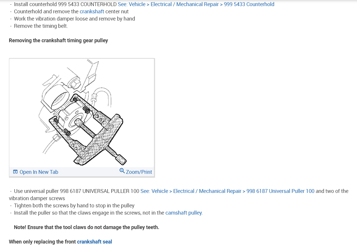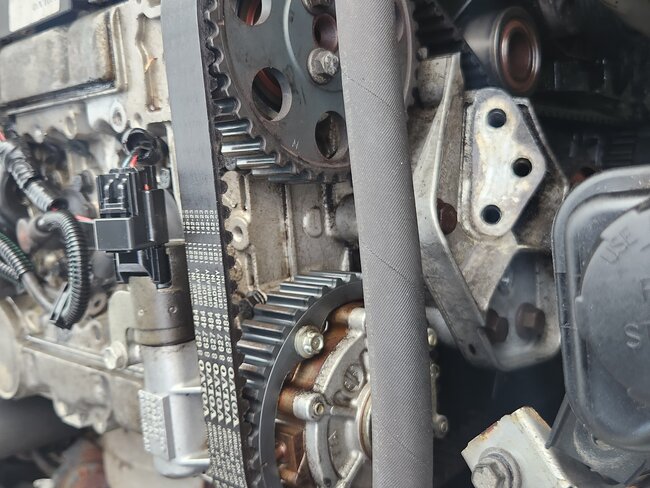 It worked but then I was double checking it and it must have slipped but the belt broke. Lol. It was probably weak from oil saturation or age and needed to be replaced anyway. I had to remove the balancer again to put the new belt on and this time I used a bolt in one of the balancer mounting holes and a pry bar up against the control arm. I was able to hit torque spec and only bend the bolt a little. It was only grade 3. It's back together now and I'm waiting for a serpentine belt this afternoon. It turns over freely by hand and stays in time. Better yet the spark plugs are out and with the coils sitting on top I can see both valves in each cylinder working. Hopefully it will fire this evening or tomorrow morning. After all this there's a good chance the leak is from the VVT on the exhaust cam. Hope not. That one looks fun. Somehow have to lock the cam, I think. It's always something. Laying on the ground is the bad part but having to wear readers to see up close is worse.