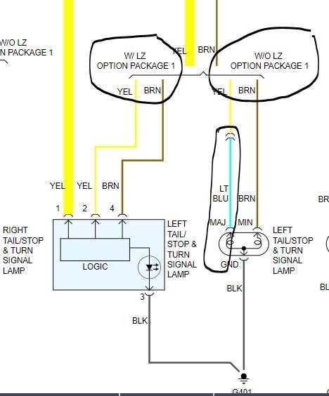 I attached a picture from the schematic of the vehicle. The brown wire is powers the element in the bulb for the parking lights. The blue is for brake lights and signal lights. Being the brake light works on the left side, that tells me the ground is good and the bulb. Which leads me to the logic module which is part of the body control module. However, I need to know if terminal A on the plug (blue wire in picture) is getting power when the signal is on.
