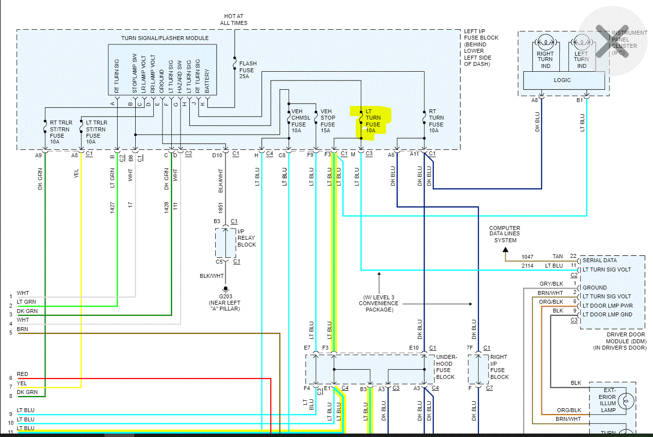If you look at pics 1-3, they are from the schematic. They show the wire I am referring to as well as the fuse. Make sure the fuse is doing its job and then check for power at the light blue wires.